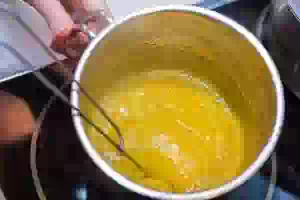 7. Поставить ковш на маленький огонь и варить при постоянном помешивании примерно 15 минут, пока смесь не загустеет и начнет пузыриться.