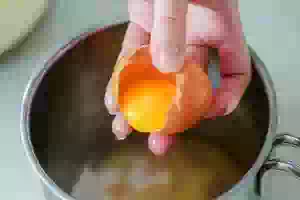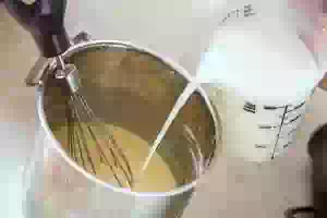 1. В ковш или кастрюлю подходящего объема растереть венчиком или миксером яйца с сахаром и щепоткой соли.