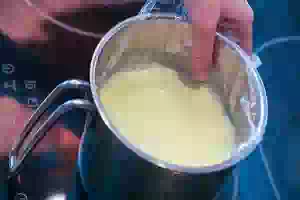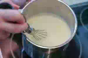 3. Влить в эту смесь молоко и поставить на небольшой огонь.