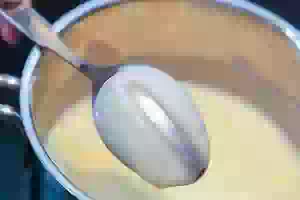 5. Для проверки готовности заварной основы для крема проведите пальцем по ложке, которой размешивали крем. Если на на ней останется четкий след, который держится и не затекает, то крем готов. Если вдруг при варке крема в нем образовались комочки, то протрите его через металлическое сито.