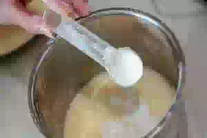 1. В ковш или кастрюлю подходящего объема растереть венчиком или миксером яйца с сахаром и щепоткой соли.