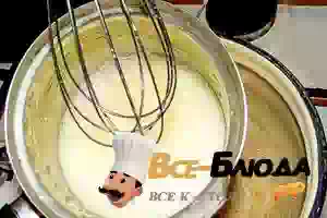 4. Теперь все ингредиенты перемешивают венчиком над водяной баней. Важно! Взбивать вино, желтки и сахар необходимо около 7 - 10 минут, пока крем не приобретет белый цвет, однородную воздушную консистенцию и не станет плотным.