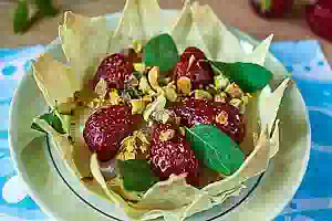 Десерт c заварным кремом, клубникой и фисташками Ингредиенты: тонкий лаваш - 1/2 шт. клубника - 6-7 шт.