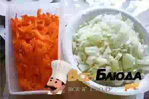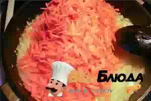 3. В высокой сковороде или в казане раскалить около стакана растительного масла (можно меньше) Высыпать в масло лук, жарить до тех пор, пока лук не станет прозрачным. Затем в лук добавить морковь. Жарить вместе минут 5-10, в конце добавить душистый перец и чёрный горошком.