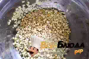 4. В кастрюлю мультиварки выложить 2/3 смеси луково-морковной. Сверху крупы после замочки (воду слить!).