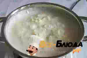 3. В кастрюлю налейте воду, положите соль, доведите до кипения. Засыпьте рис.