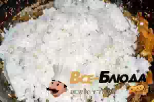 5. Рис, сваренный до полуготовности, добавьте в сковороду.