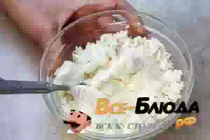 2. Пока варится овсянка, сухой жирный творог протереть через сито или просто размять вилкой. Добавить к творогу сахар, щепотку ванилина и перемешать.