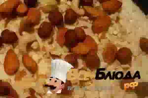 3. На сковороду выкладываем ровным слоем половину каши, сковороду предварительно смазать маслом. Орехами (целыми или толчеными) посыпаем сверху. Орехи можно брать любые. Далее должен быть слой пенок.