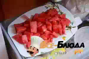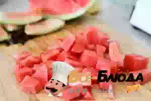 1. Дольки спелого сочного арбуза порезать пополам, удалить все семечки и срезать кожуру. Арбузную мякоть порезать небольшими кубиками.