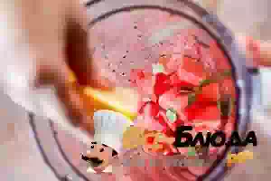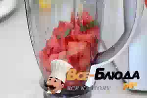 3. В блендер засыпать подмерзшие кусочки арбуза и листики мяты.