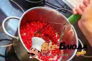 2. Пересыпать калину в кастрюлю и слегка помять ложкой или толкушкой для картошки. Осторожно! Ягоды сочные, брызги летят во все стороны. Можно в отдельной посуде слега пробить калину погружным блендером, а затем переложить в кастрюлю.
