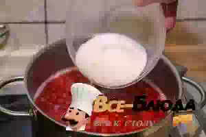 4. Как только вода закипит, примешать сахар. Добавляйте сахар по вкусу! Уменьшить огонь до минимального и варить компот под крышкой 5 минут. Снять кастрюлю с плиты и дать напитку настояться хотя бы 1 час. Готовый компот из калины разлить по стаканам. Можно пить и горячим, и холодным.
