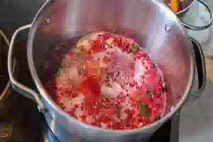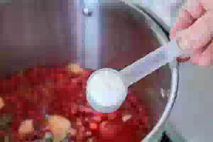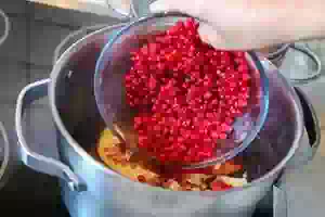 4. Следом в кастрюлю с кипящей водой пересыпать красную смородину.