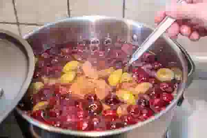 5. Спустя 10 минут добавить вишню. Размешать и дождаться, когда компот снова закипит. Уменьшить нагрев и проварить 5 минут.