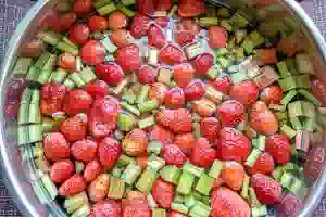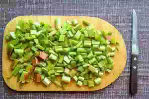 1. Длинные стебли вымыть и порезать на кусочки. При этом кожуру счищать не требуется.