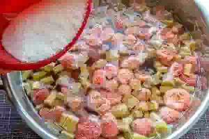 2. Сложить в кастрюлю нарезанный ревень и клубнику, залить водой и довести до кипения.