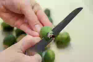 1. У фейхоа срезать кончик. Каждую ягоду разрезать вдоль пополам.