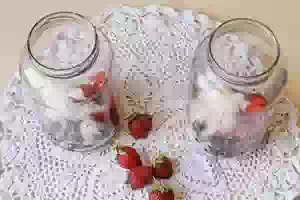 1. Ягоды сложить промыть в холодной воде и откинуть на дуршлаг. У клубники удалить чашелистики. Косточки из вишни доставать не нужно. Двухлитровые банки нужно помыть и простерилизовать удобным для вас способом (в духовом шкафу, микроволновой печи или на водяной бане). Крышки обдать кипятком или прокипятить в кастрюле.