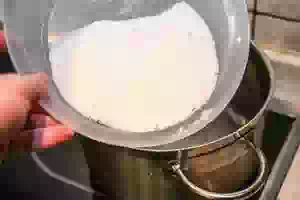 1. Подготовить фрукты. Отвесить 150г сахара, высыпать в кастрюлю и залить водой. Довести воду до кипения, уменьшить огонь и проварить, чтобы сахар полностью растворился.