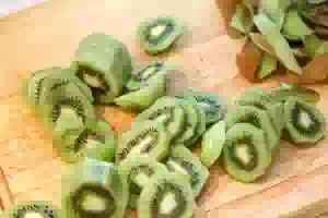 2. С киви срезать кожуру. Очищенный фрукт порезать дольками или кружочками.