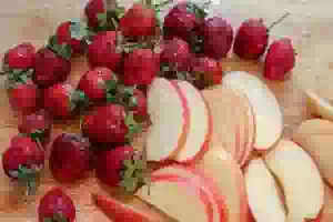 1. Спелую ароматную клубнику перебрать, выбросить все подпорченные ягоды, промыть под проточной водой, откинуть на дуршлаг и удалить чашелистики. Яблоки вымыть, разрезать пополам, удалить сердцевину. Каждую половинку порезать дольками.
