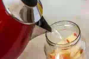 3. Залить клубнику с яблоками крутым кипятком, чтобы вода начинала переливаться через край. Прикрыть банку крышкой и дать в таком виде постоять 15 минут.