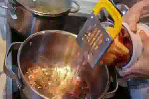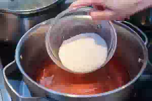 5. Добавить в кастрюлю с отваром сахар, размешать, чтобы кристаллы быстрее растворились, и довести до кипения. Снизить огонь до минимума и кипятить примерно 5 минут.