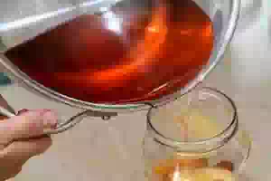 4. Через 15 минут слить воду из банок в кастрюлю, удерживая фрукты и ягоды в банке.