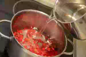 4. Уменьшить огонь под кастрюлей, добавить сахар, проварить примерно 5 минут.