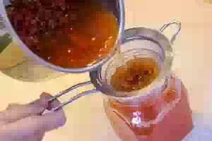 5. Готовый компот процедить, чтобы не мешали ягодные косточки. Компот из калины с шиповником готов, можно пить.