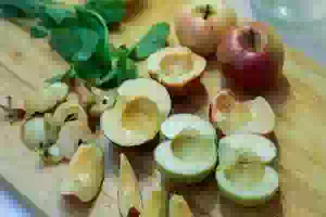 2. Яблок для компота должно быть столько, чтобы яблочные дольки заняли примерно половину объема банки. Добавить к яблокам 1-2 ломтика лимона и свежую мяту.