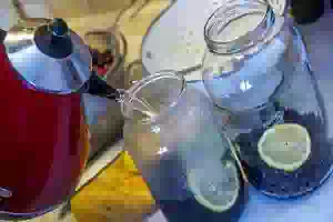5. Залить банки с черной смородиной, мятой и лимоном кипятком по самое горлышко, накрыть блюдцем (или крышкой) и оставить на 15-20 минут.