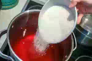 5. Добавить сахар и вернуть кастрюлю с сиропом на плиту. Дождаться, когда жидкость закипит, уменьшить огонь до минимального и проварить примерно 5 минут.