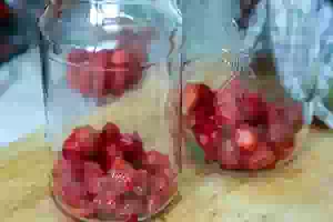 2. На дно стерилизованных банок насыпать сначала ягоды клубники.