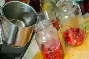 7. Разлить сразу же горячий сироп по банкам. Он должен слегка переливаться через край, иначе после закрутки крышек в банках останется пустое пространство.