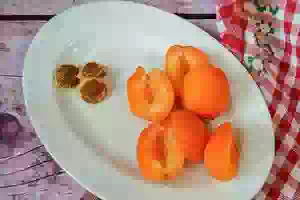1. Подготовим ингредиенты, необходимые для абрикосового компота со специями. Кроме абрикоса нам потребуются бадьян, корица в палочках или молотая и корень имбиря. Абрикосы моем, делим каждый плод пополам и удаляем косточку.