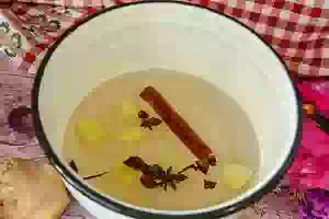 3. Приготовим сахарный сироп со специями. Для этого в воду добавим сахар, очищенный и нарезанный пластинами корень имбиря, звездочки бадьяна и палочки корицы. Вскипятим и дадим провариться 1-2 минуты на слабом огне. Горячий сироп снимем с плиты.