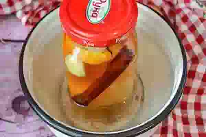 6. Простерилизованные банки с абрикосами вынимаем банку, герметично закатываем крышками и переворачиваем вверх дном. Компот из абрикосов с корицей и имбирем готов. Для хранения компота не требуется особенных условий. Он отлично хранится в кухонном шкафу.