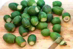 1. Плоды фейхоа промыть под холодной проточной водой, откинуть на дуршлаг, дать лишней жидкости стечь. У каждой ягоды обрезать кончики с обоих концов.