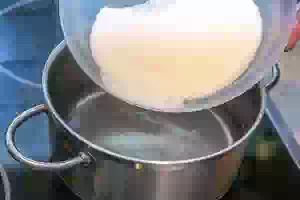 3. Сварить сахарный сироп для компота. Для этого довести до кипения чуть больше 2х литров воды, высыпать весь сахар и добавить на кончике ножа лимонной кислоты. Размешать и дождаться, когда сироп закипит.
