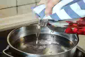 4. Затем аккуратно, придерживая горячую банку полотенцем, слить воду в кастрюлю. Все ягоды должны остаться в банке.