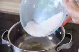 5. Добавьте в слитую воду сахар, регулируя его количество на свой вкус. Размешать, довести до кипения и проварить ещё 2-3 минуты, не забывая помешивать сироп, чтобы все кристаллы сахара окончательно растворились.