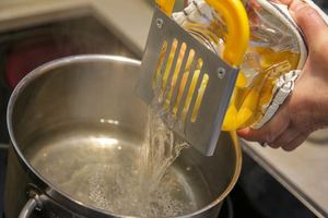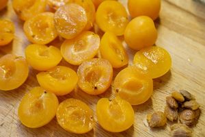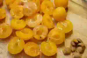 1. Банки вымыть горячей водой с содой, простерилизовать любым удобным для вас способом. Крышки залить кипятком. Жёлтую алычу перебрать, отбраковывая подгнившие плоды и выбирая только самые зрелые, сочные. Промыть ягоды под проточной водой и откинуть на дуршлаг. Разрезать ягоды пополам, удалить косточки.