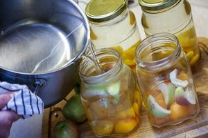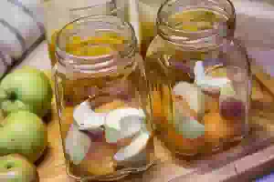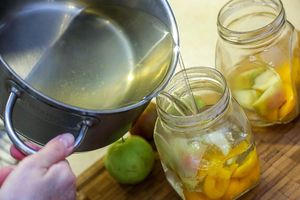 8. Разлить сироп по банкам, герметично укупорить крышками и перевернуть вверх дном. Прикрыть банки с компотом пледом и оставить на ночь медленно остывать. Готовый компот из жёлтой алычи с яблоками хранить в сухом прохладном месте.