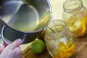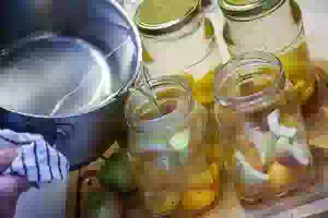 5. Залить содержимое банок кипятком так, чтобы вода начала переливаться через горлышко. Прикрыть банки с алычой крышками, оставить в таком виде на 20 минут.