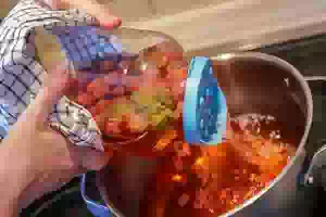 3. Через 15 минут слить отвар из банок с ягодами, лимоном и мятой в кастрюлю подходящего объема.