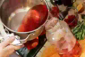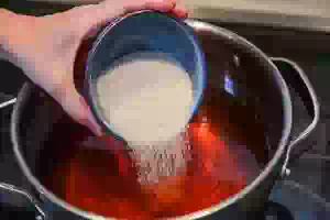 4. Засыпать в кастрюлю с ягодным отваром сахар и поставить на плиту. Дождаться, когда жидкость закипит, уменьшить огонь до минимального и проварить 5 минут.