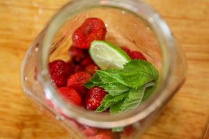 1. Банки для компота вымыть с пищевой содой, ополоснуть под проточной водой и простерилизовать любым удобным способом. Крышки залить кипятком. Клубнику перебрать, промыть в холодной воде, после чего у каждой ягоды оборвать плодоножки с чашелистиками. Лайм вымыть, нарезать тонкими кружочками. Оборвать листья мяты с веточек, промыть в холодной воде, стряхнуть лишнюю воду. Когда все продукты для компота будут готовы, разложить по банкам клубнику.