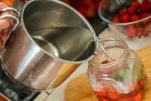 5. Через 15 минут слить отвар из банок с клубникой, лаймом и мятой в кастрюлю подходящего объема.